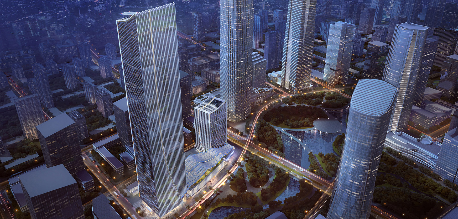 建筑高度:326.1m(65層) 幕墻面積:7.1萬m2 項目設計:Aedas建筑設計事務所 幕墻類型:單元式玻璃幕墻等