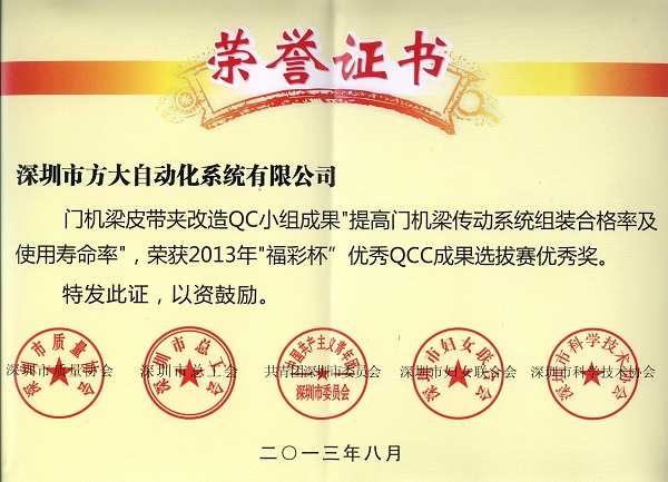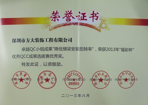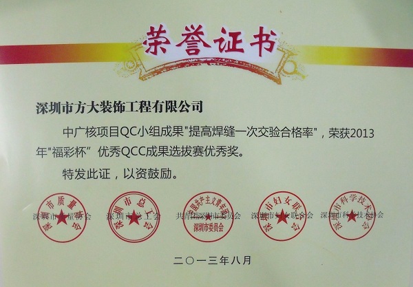2013年9月24日,方大裝飾工程有限公司獲得由深圳市質(zhì)量協(xié)會、深圳市總工會、共青團(tuán)深圳市委員會、深圳市婦女聯(lián)合會和深圳市科技技術(shù)協(xié)會聯(lián)合頒發(fā)的“2013年深圳市質(zhì)量管理小組活動優(yōu)秀企業(yè)”稱號。同日,由深圳市質(zhì)量協(xié)會、深圳市總工會、共青團(tuán)深圳市委員會、深圳市婦女聯(lián)合會和深圳市科技技術(shù)協(xié)會聯(lián)合評定的“福彩杯”優(yōu)秀QCC成果選拔賽優(yōu)秀獎揭曉。方大裝飾公司卓越QC小組成果“降低橫梁安裝扭轉(zhuǎn)率”、中廣核項(xiàng)目QC小組成果“提高焊縫一次交驗(yàn)合格率”和方大自動化系統(tǒng)有限公司門機(jī)梁皮帶夾改造QC小組成果“提高門機(jī)梁傳動系統(tǒng)組裝合格率及使用壽命率”被授予 “深圳市2013年‘福彩杯’QCC成果選拔賽優(yōu)秀獎”;集團(tuán)公司企業(yè)管理部尚清波獲得“深圳市質(zhì)量管理小組活動優(yōu)秀推進(jìn)者” 稱號。