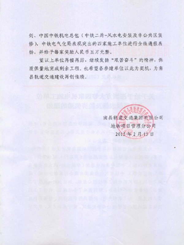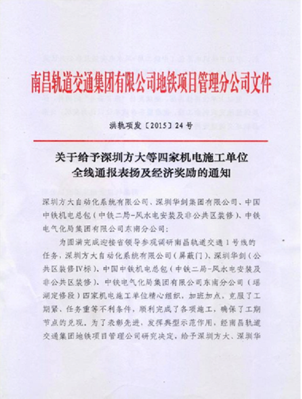 新年伊始,方大自動化公司再次喜獲嘉獎。南昌軌道交通集團為表揚先進,決定給予深圳市方大自動化系統(tǒng)有限公司等四家施工單位通報表揚。并給予五萬元獎勵。