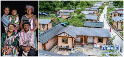 這是一張拼版照片。左圖:怒江傈僳族自治州貢山縣獨龍江鄉迪政當村獨龍族的“文面女”李文仕(前排左)一家合影(6月21日攝);右圖:李文仕和其他村民的房子(6月21日攝),這些房子是當地政府在2011年統一修建的。新華社記者 江文耀 攝