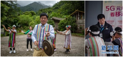 這是一張拼版照片。左圖:在怒江傈僳族自治州貢山縣獨龍江鄉移動營業廳上班的馬春海(獨龍族)。在他身后,獨龍族群眾在跳本民族舞蹈(6月21日攝);右圖:馬春海在指導當地群眾體驗5G虛擬現實設備。獨龍江鄉今年開通了5G試驗基站(6月21日攝)。新華社記者 江文耀