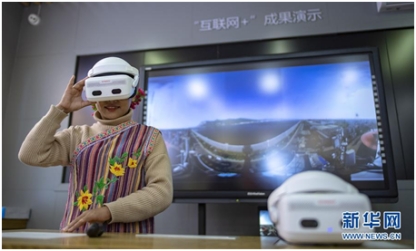 獨龍族姑娘熊玉蘭在怒江傈僳族自治州貢山縣獨龍江鄉體驗VR眼鏡(4月19日攝)。新華社記者 江文耀 攝