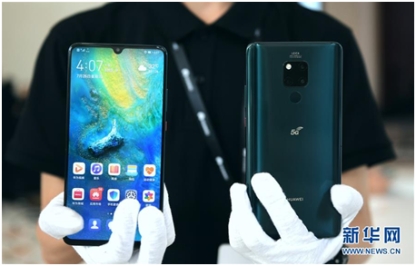 工作人員展示華為公司發布的首款5G商用手機——華為Mate 20 X 5G(7月26日攝)。新華社記者 毛思倩 攝