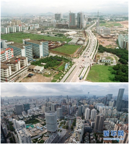 拼版照片:上圖為位于深圳南頭半島上的南油開發區(資料照片,新華社記者張肄文攝);下圖為2018年6月20日拍攝的原南油開發區(新華社記者毛思倩攝)。新華社發