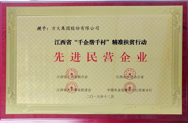 10月12日,江西省“千企幫千村”精準扶貧行動工作推進會在南昌召開,會議對 “千企幫千村”先進民營企業和商會進行了表彰,方大集團榮獲江西省“千企幫千村”精準扶貧行動先進民營企業稱號。