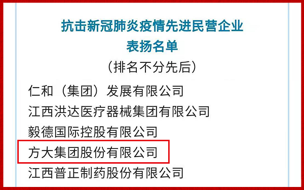 近日,中華全國(guó)工商業(yè)聯(lián)合會(huì)發(fā)布《全國(guó)工商聯(lián)關(guān)于對(duì)抗擊新冠肺炎疫情做出優(yōu)異成績(jī)的先進(jìn)民營(yíng)企業(yè)予以表?yè)P(yáng)的通報(bào)》,對(duì)“抗擊新冠肺炎疫情先進(jìn)民營(yíng)企業(yè)”給予表?yè)P(yáng),方大集團(tuán)榜上有名。